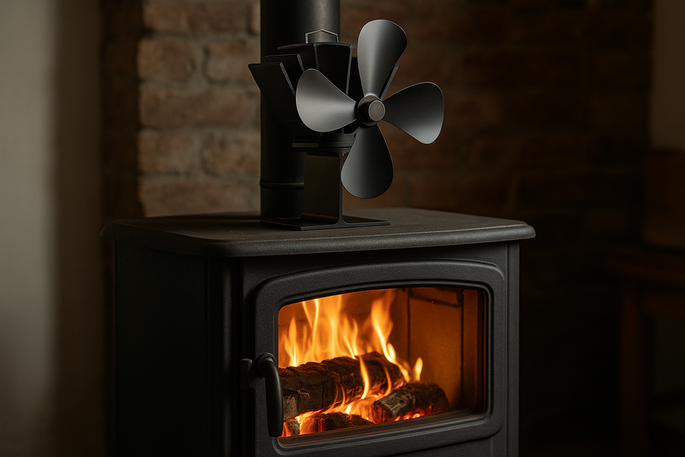 En varmemølle fungerer ved at udnytte varmen fra brændeovnen til at drive en lille motor, der igen driver blæseren. Dette hjælper med at cirkulere den varme luft jævnt i rummet uden behov for ekstern strøm.
