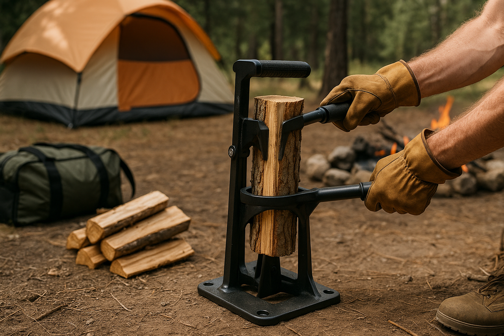 En manuel brændekløver er ofte det bedste valg til camping, da den er let at transportere og ikke kræver strøm.