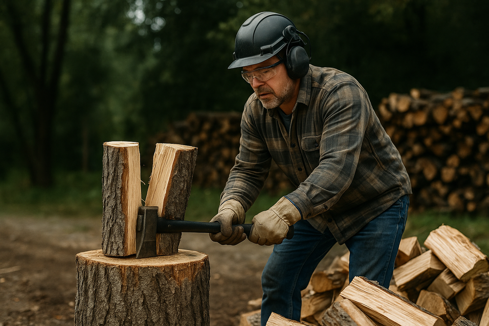 For at kløve brænde sikkert, skal du altid bære beskyttelsesudstyr som sikkerhedsbriller og handsker. Sørg for, at arbejdsområdet er klart og fri for forhindringer, og brug korrekt teknik for at undgå skader.